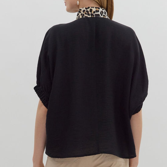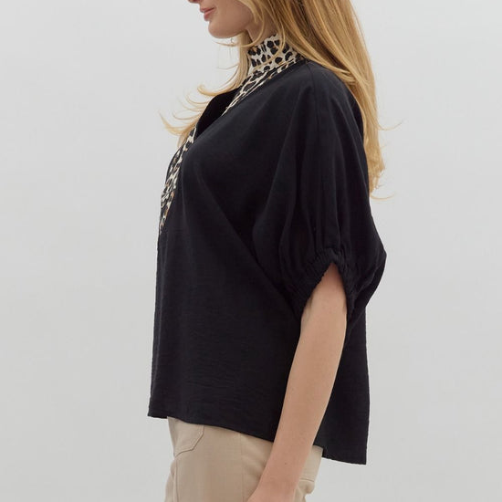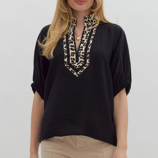 Solid elasticated sleeve band dolman top featuring leopard print accented caftan-inspired split neck placket. Unlined. Woven. Non-sheer. Lightweight.