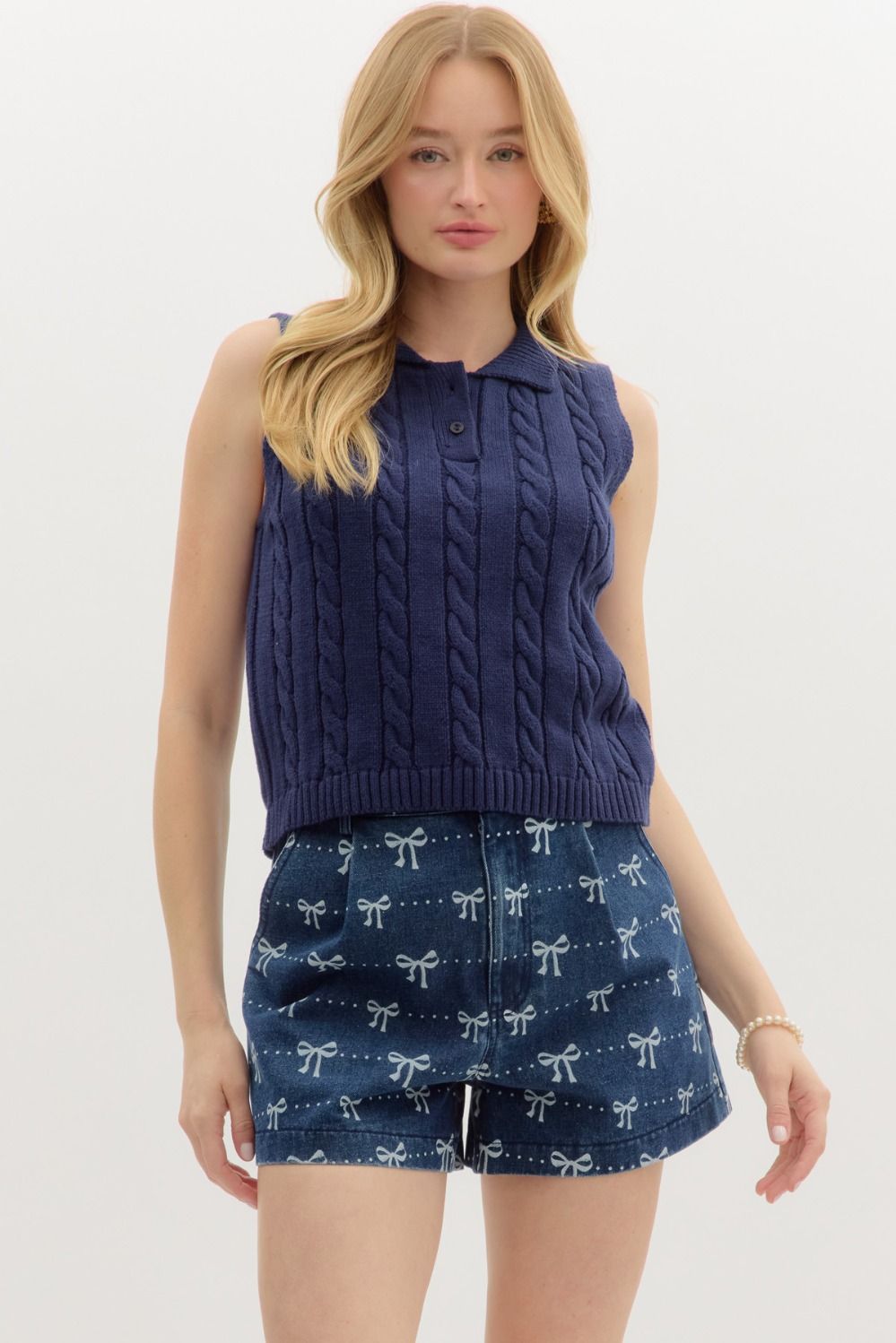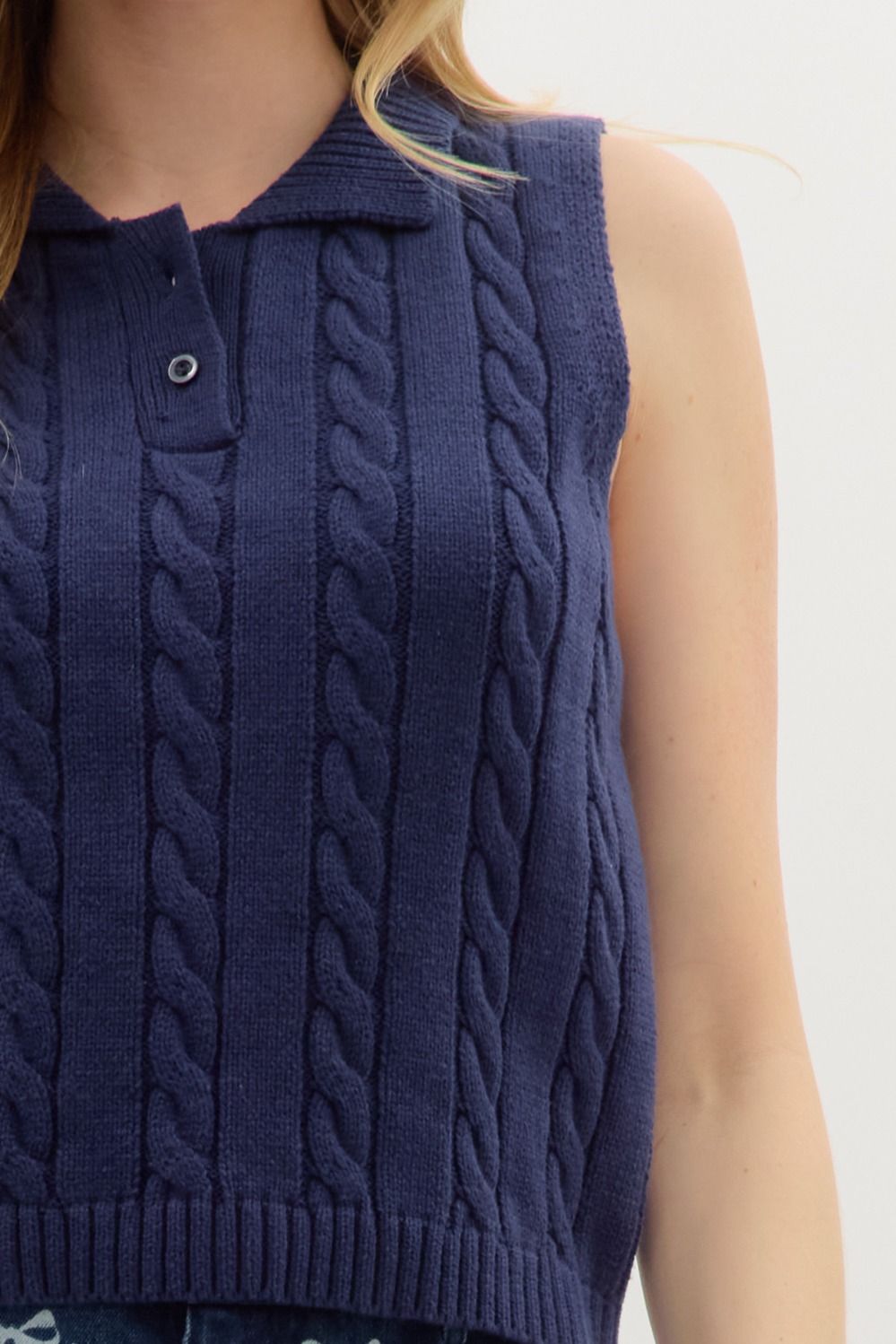 Solid sleeveless cable knit pullover top featuring collar button closure at front. Unlined. Knit. Non-sheer. Lightweight.