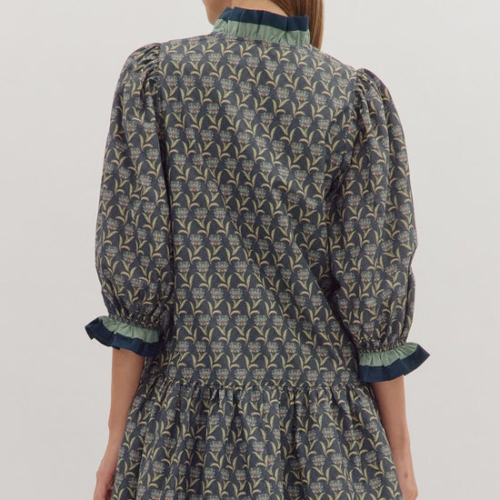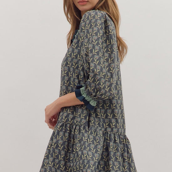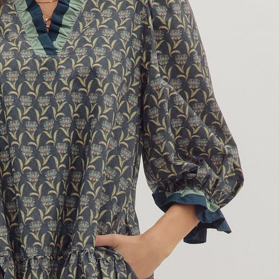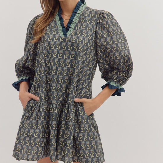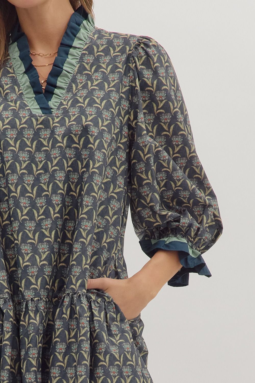 Floral print 3/4 puff sleeve mini dress featuring contrast ruffled trim V-neck. Contrast ruffle cuffs. Ruffle hem. Side pockets. Lined. Woven. Non-sheer. Lightweight.