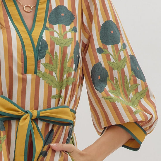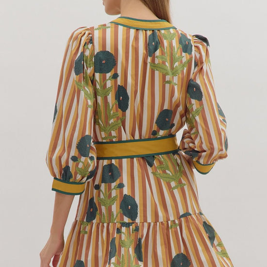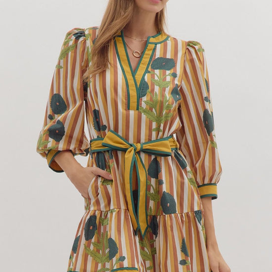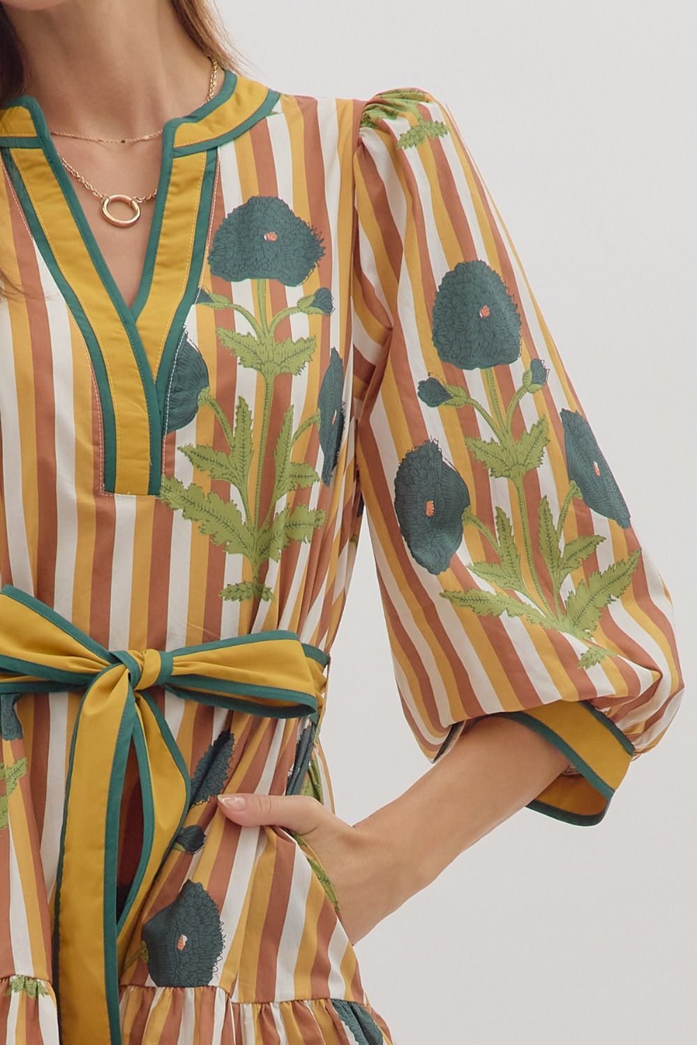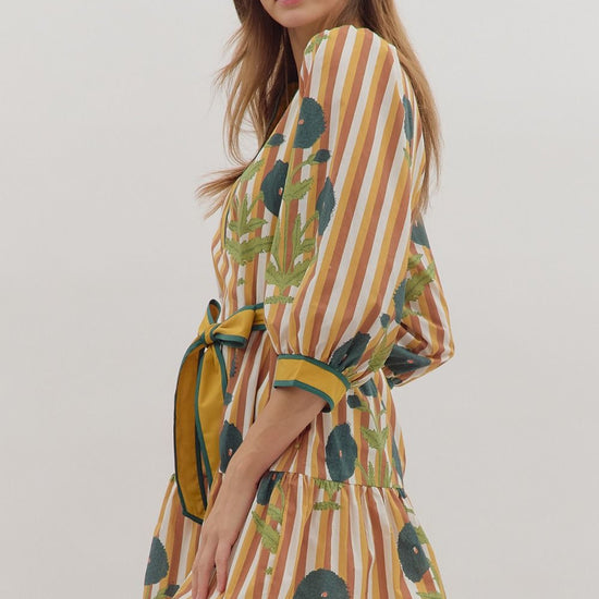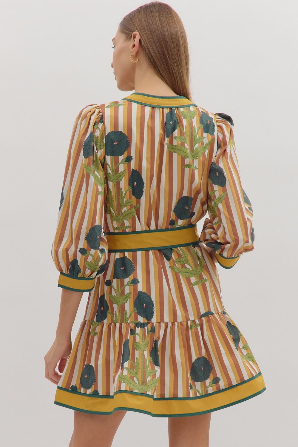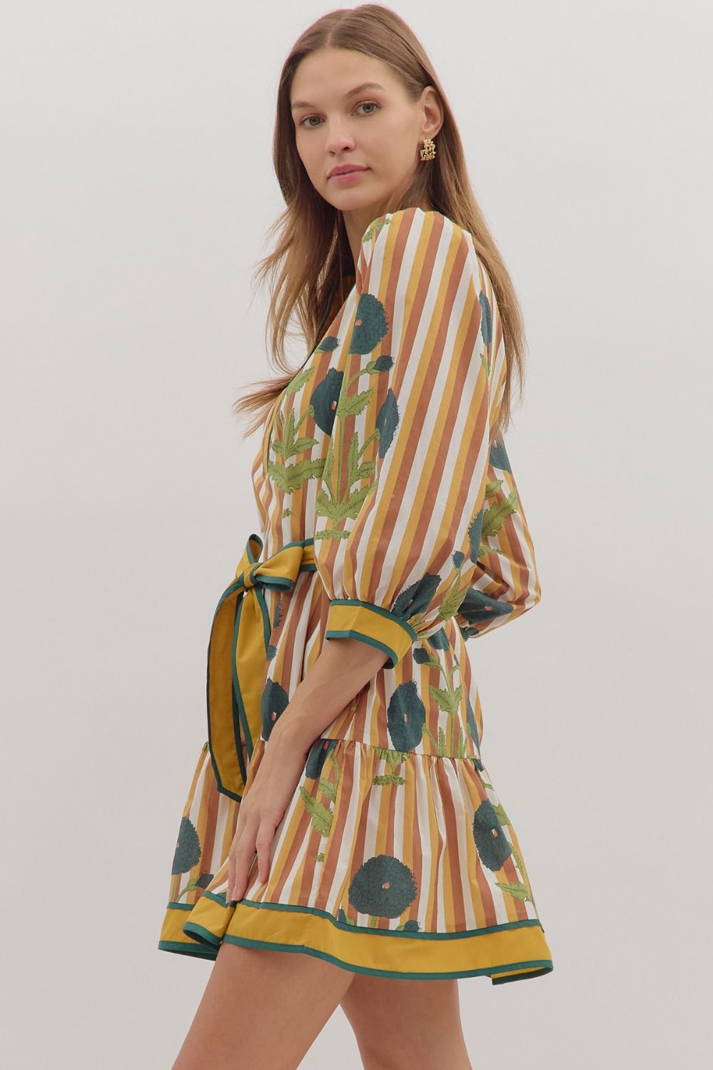 Floral stripe print 3/4 puff sleeve mini dress featuring V-neck with contrast trim and adjustable self-tie belt at waist. Ruffle hem. Side pockets. Lined. Woven. Non-sheer. Lightweight.