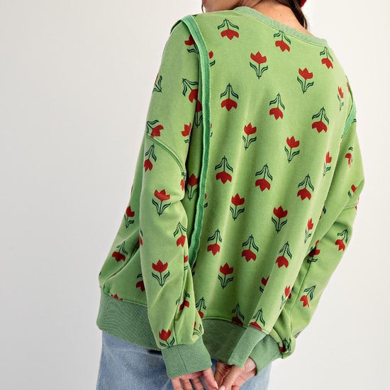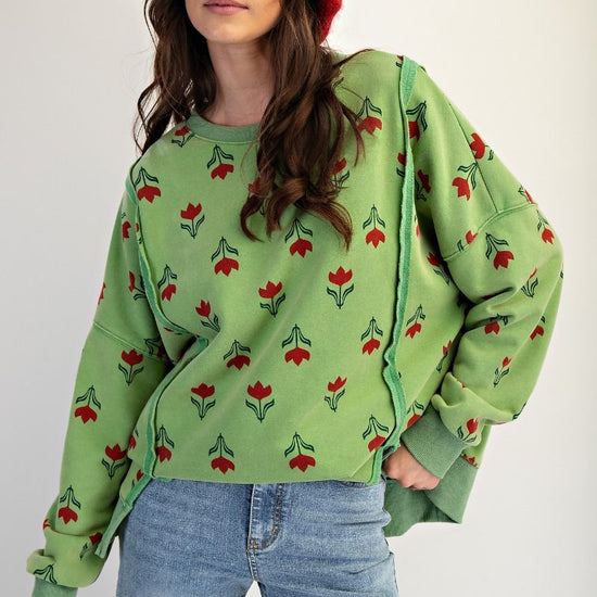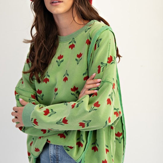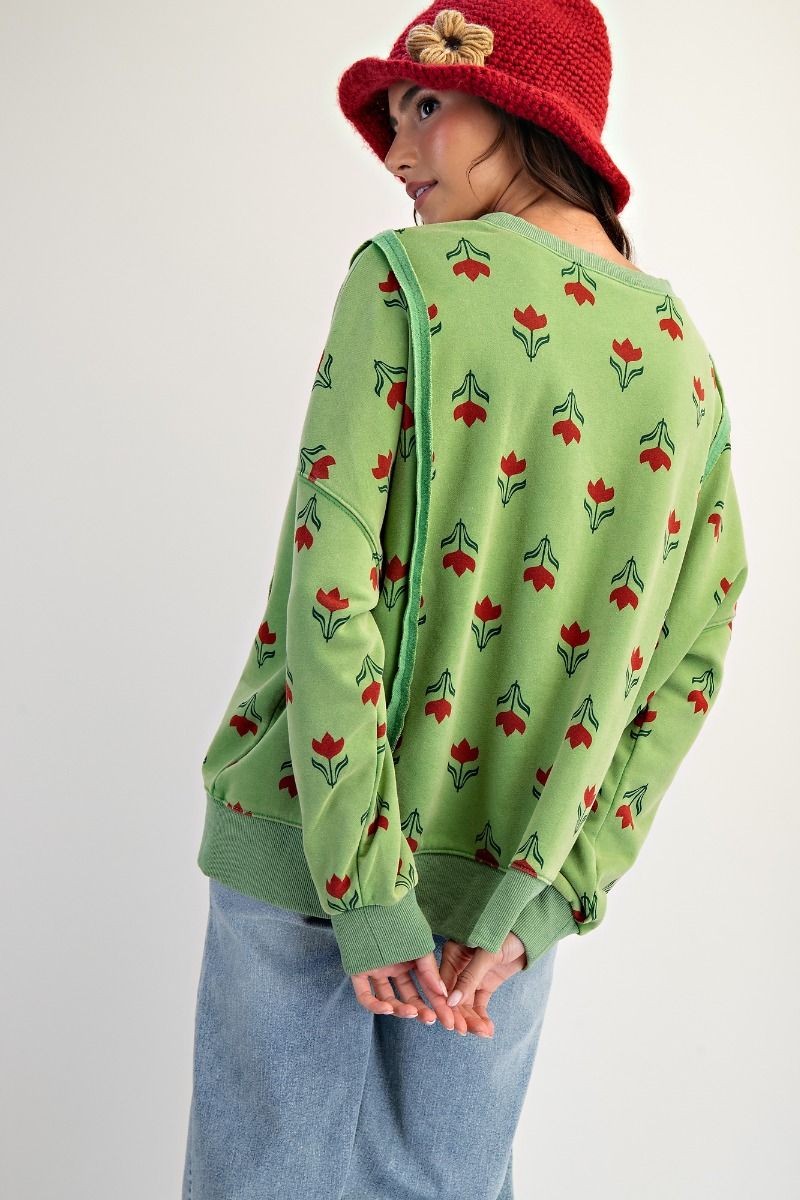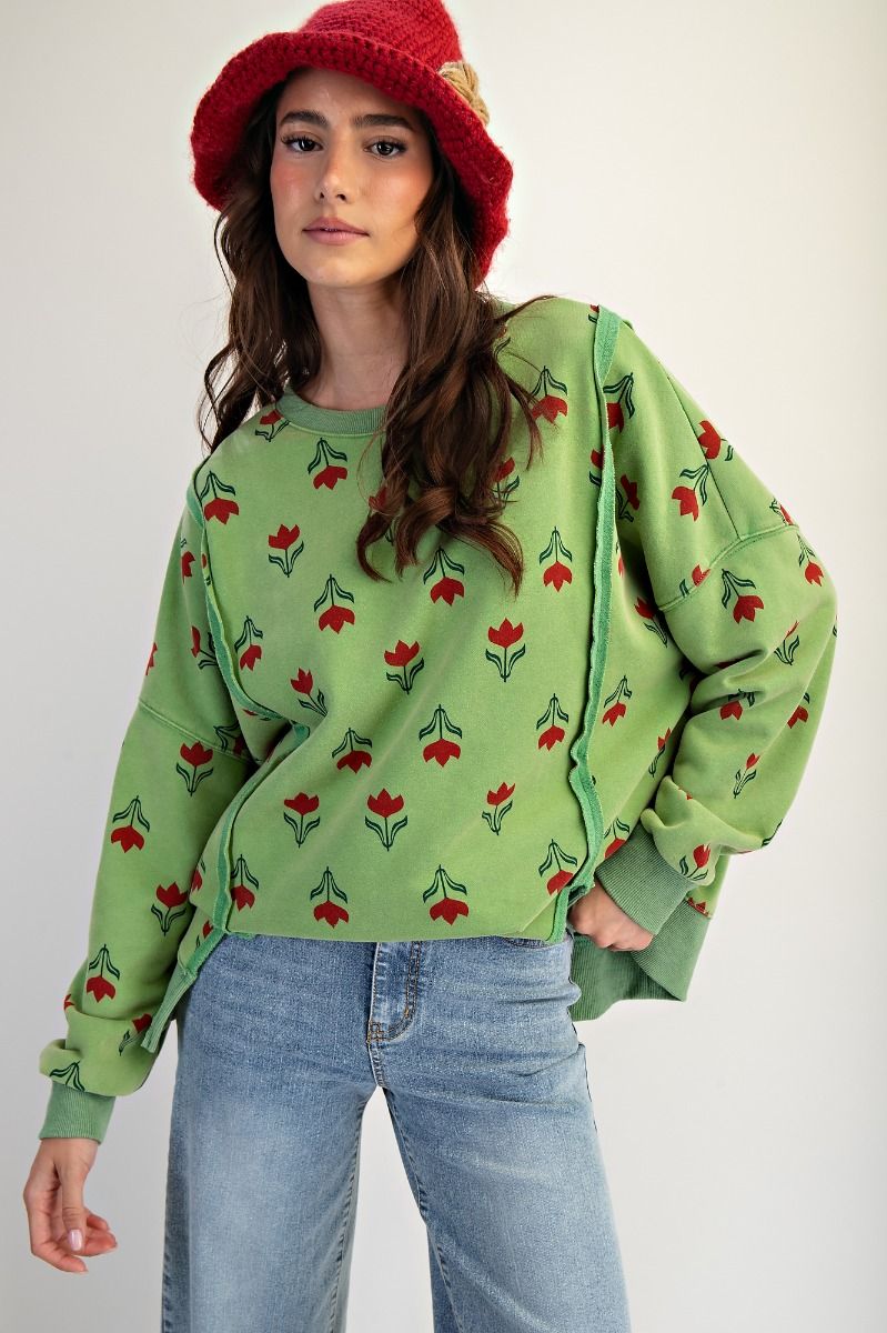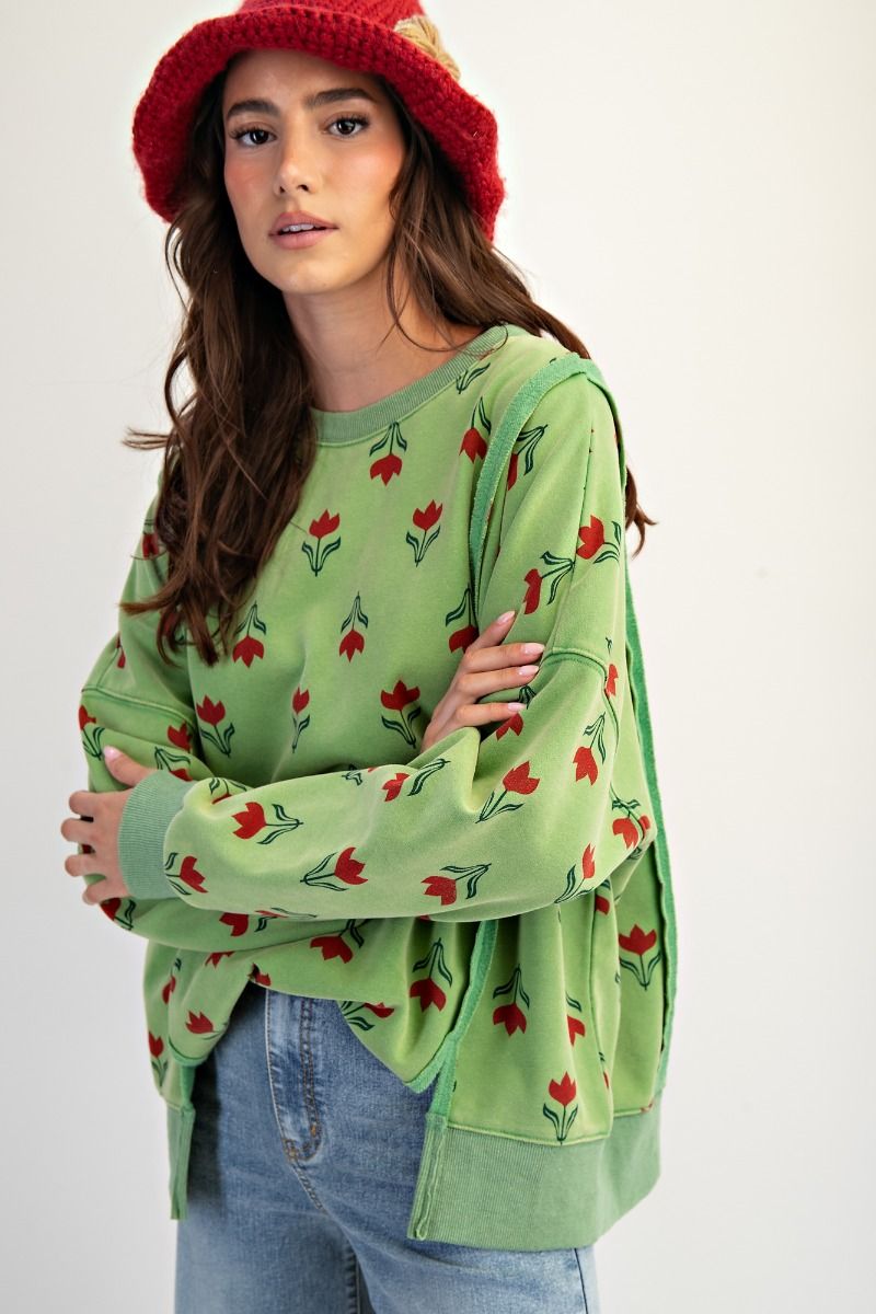 Mineral wash, oversized sweatshirt Style, Tulip Graphic, Crew Neckline with ribbed dropped shoulders, side hem slits