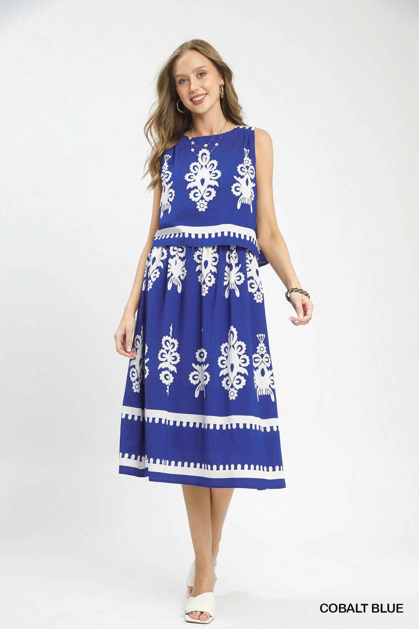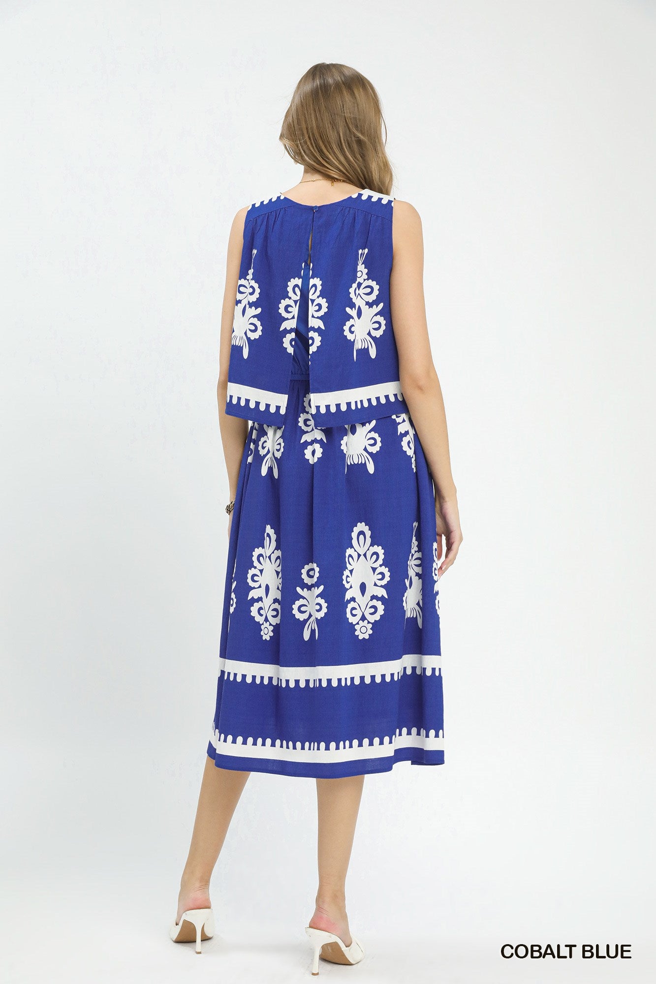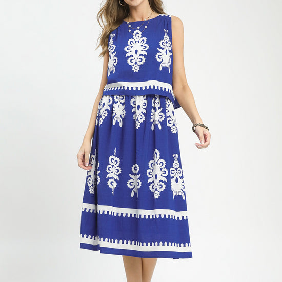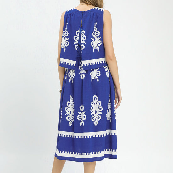 Two Tone Sleeveless Border Print Tiered Midi Dress