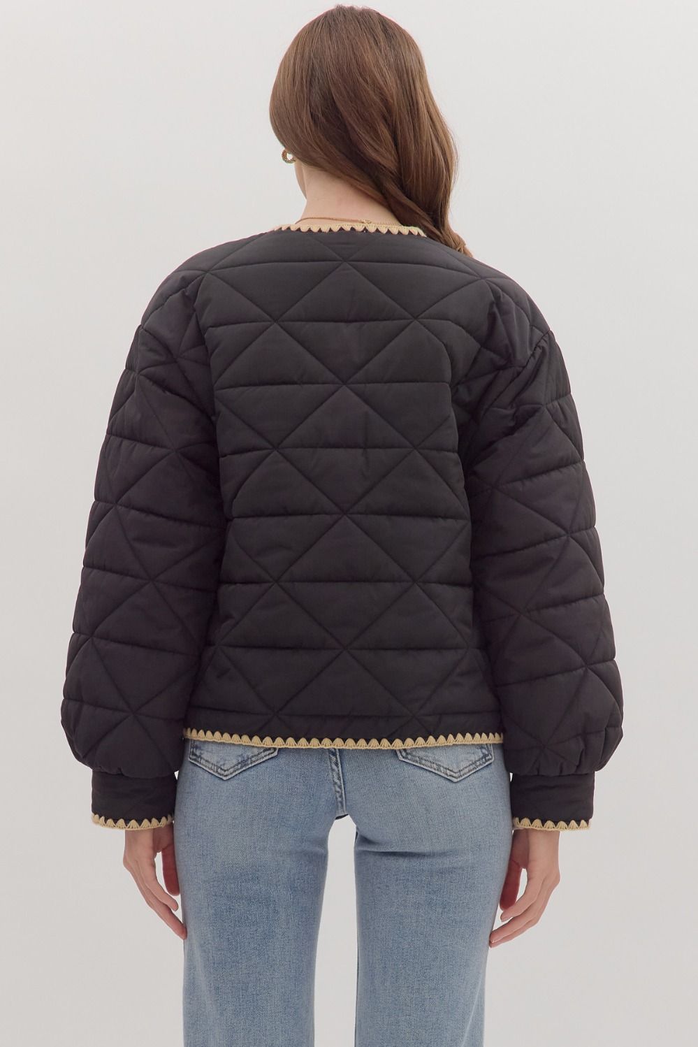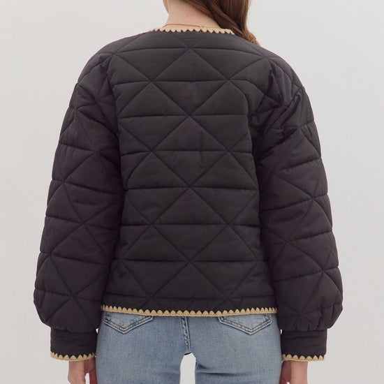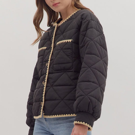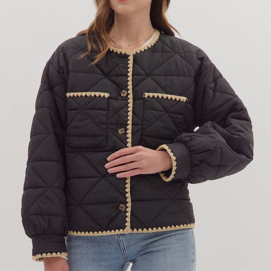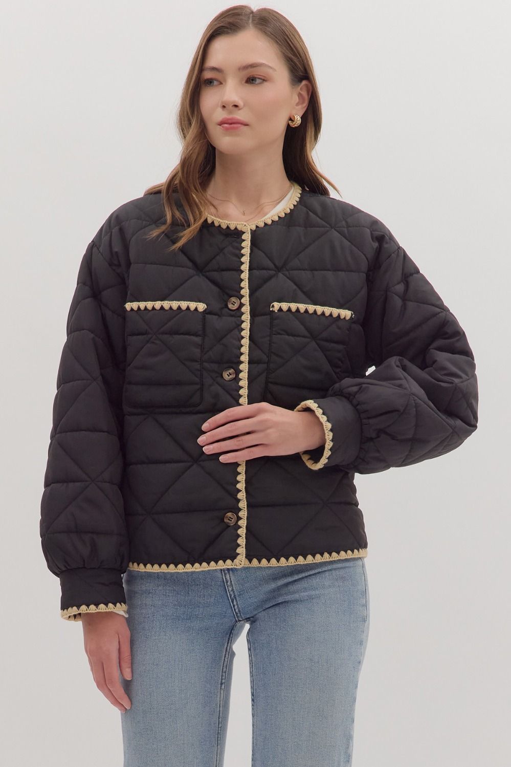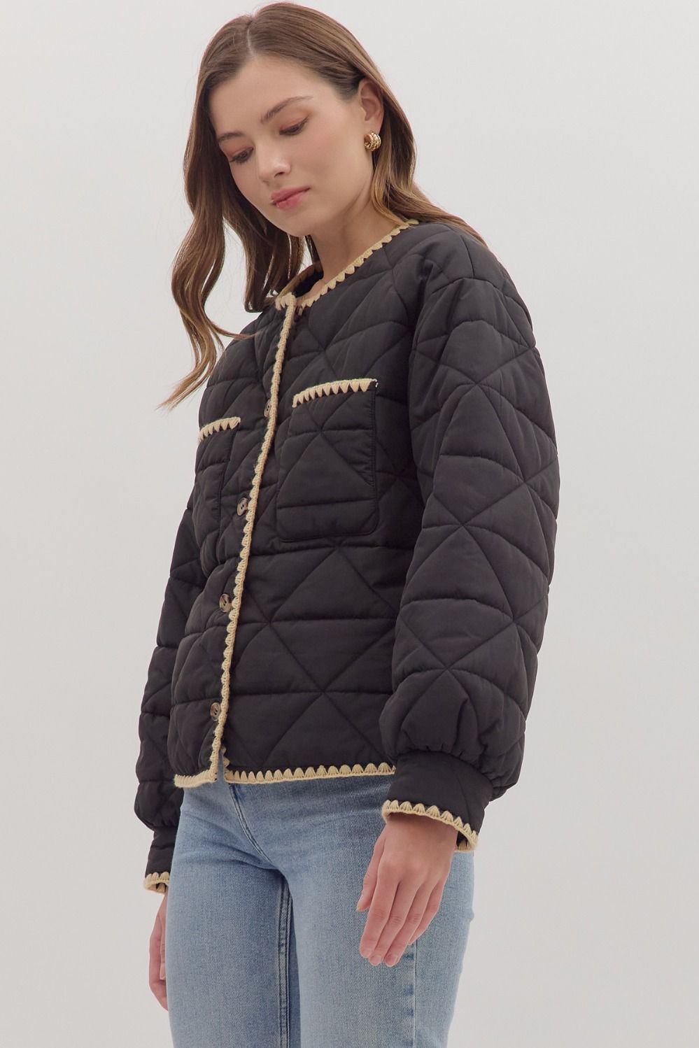 Solid long sleeve quilted jacket featuring scallop accent trim and front patch pockets. Button closure at front. Lined. Woven. Non-sheer. Medium weight.