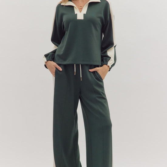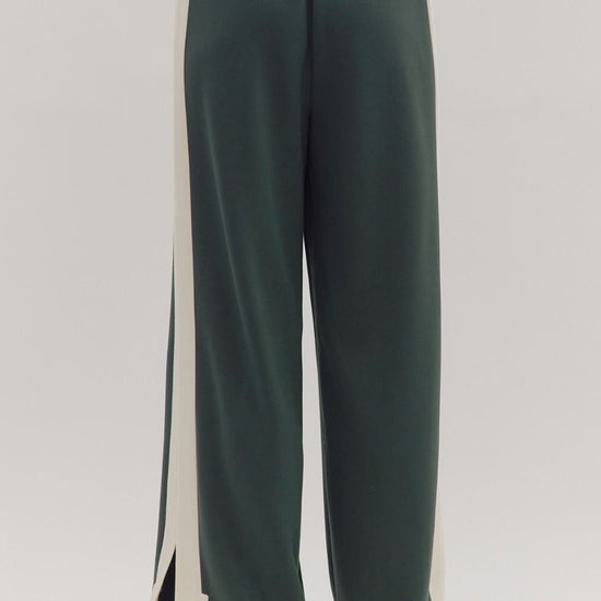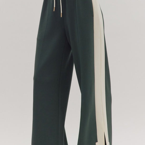 Solid wide leg knit pants featuring elastic waistband with drawstring. Contrast stripe detail at sides with slit hem. Side pockets. Unlined. Knit. Non-sheer. Lightweight.