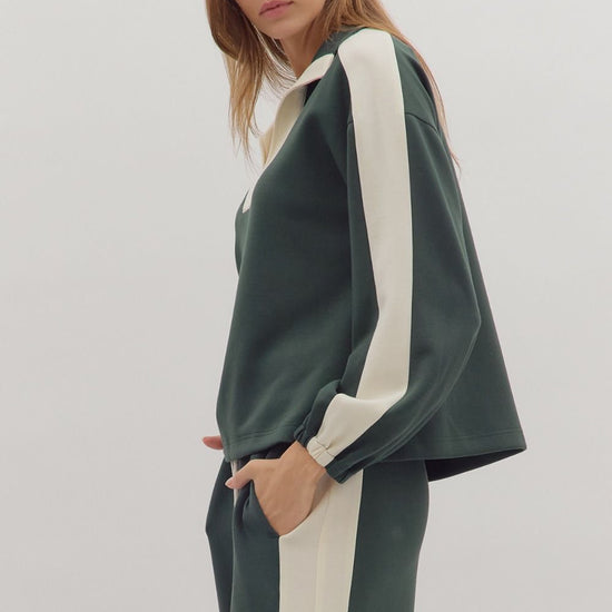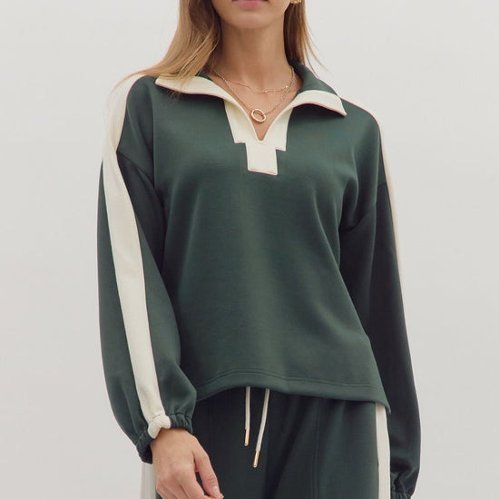 Solid long sleeve knit top featuring contrast collar and contrast stripe detail at sleeves. Side slits at hem. Elasticated sleeve openings. Unlined. Knit. Non-sheer. Lightweight.
