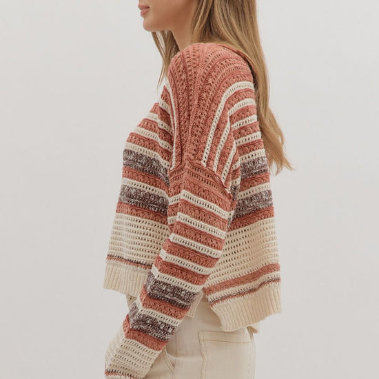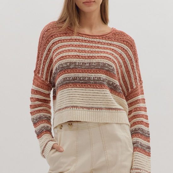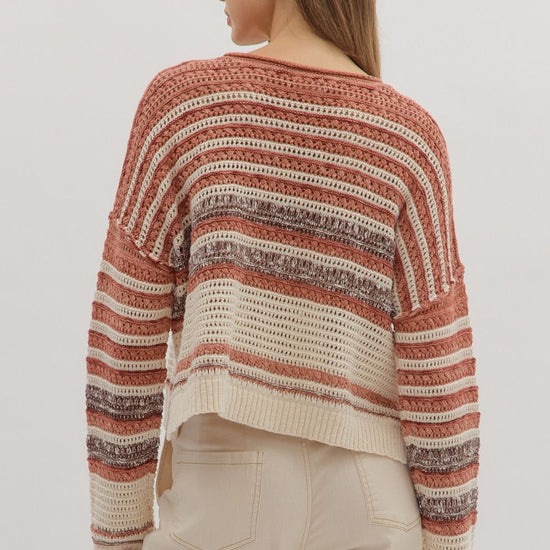Striped long sleeve knit top featuring drop shoulder. Unlined. Knit. Non-sheer. Medium weight.