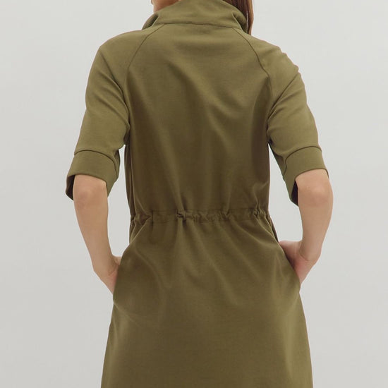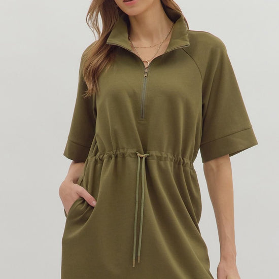 Solid short sleeve zip-front high neck closure pullover mini dress featuring adjustable drawstring at waist. Side pockets. Unlined. Knit. Non-sheer. Lightweight.